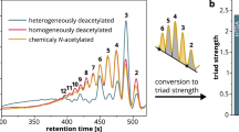 In contrast to DP and FA, the PA is more difficult to analyse and control11. Initially, chitosans produced by the heterogeneous de-N-acetylation of chitin were thought to possess blocks of acetyl groups, whereas chitosans produced by homogeneous de-acetylation or N-acetylation were predicted to have a more random PA12,13,14. However, 13C nuclear magnetic resonance (NMR) spectroscopy showed that dyad frequencies of commercially available chitosans do not differ from what is expected for random PA, regardless of the production method15,16. It has therefore been impossible to investigate the potential influence of acetylation patterns on the properties and activities of chitosan polymers, but theoretical considerations strongly suggest that such an influence exists5. Importantly, natural chitosans are likely to possess non-random acetylation patterns due to their enzymatic route of synthesis.