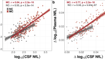 The concentrations of neurofilament light chain in murine CSF (except for Fig. 1) were determined using the highly sensitive SimoaTM NF-Light Advantage assay Kit (Quanterix). CSF samples were prediluted up to 1:1000 in NF-Light sample diluent and measured in duplicate on a Simoa HD-1 or HD-X Analyzer (Quanterix) according to the manufacturer’s instructions, and as reported previously59. Internal reference samples were measured as controls on every plate. CSF NfL levels in Fig. 1 are from a previous publication and from our intramural mouse bio- and databank, and were quantified using an electrochemiluminescence immunoassay (see legend, Fig. 1).