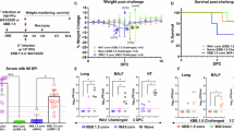 Syrian hamsters are highly susceptible to SARS-CoV-2 and have been widely used in COVID-19 research35,36,37. Given the intrinsic shortcomings of the K18-hACE2 mouse model due to fatal neuroinvasion, we further evaluated the possible attenuation of Nsp1-K164A/H165A in hamsters. To this end, five groups of 6-month-old Syrian hamsters were intranasally inoculated with 104 PFU of each virus or left uninoculated. This inoculum has consistently yielded weight loss, clinical signs, and lung pathology in Syrian hamsters38. Shown in Fig. 3a, WA1/2020-infected hamsters showed 18% weight loss on 7 dpi, whereas ΔPRRA, and Nsp1-N128S/K129E groups displayed no more than 5% weight loss over a period of 14 days. Nsp1-K164A/H165A infected animals (n = 8), like the uninfected group, had no weight loss at all through the study. During the first four days following infection, the log10-transformed infectious viral titers in nasal wash samples were measured by a TCID50 assay. Shown in Fig. 3b, the infectious titers from Nsp1-K164A/H165A infected animals were about two log10 lower than that of WA1/2020-infected hamsters at 1 and 2 dpi and trended lower than those from ΔPRRA and Nsp1-N128S/K129E-infected animals. Infectious nasal viral titers from all groups subsided to just above the limit of quantification at 4 dpi. Similarly, subgenomic RNA (sgRNA) titers in nasal turbinates from all groups were just above limit of quantification at 4 dpi (Fig. 3c). Log10-transformed sgRNA copies per ml in lung homogenates were 5.5 (IQR, 5.1 to 6.1), 4.0 (IQR 3.5 to 4.4), 3.5 (IQR 3.3 to 4.3), 4.5 (IQR 4.0 to 4.9), for WA1/2020, ΔPRRA, Nsp1-K164A/H165A, and Nsp1-N128S/K129E infected hamsters, respectively, at 4 dpi (Fig. 3c); median log10-transformed infectious viral titers in lung homogenates were 7.1 (IQR 7.0 to 7.2), 6.0 (5.8 to 6.1), 4.3 (IQR 3.7 to 5.3), 6.1 (IQR 5.4 to 6.4) for WA1/2020, ΔPRRA, Nsp1-K164A/H165A, and Nsp1-N128S/K129E infected hamsters, respectively (Fig. 3d). RNAscope revealed that viral RNA was present only along the bronchial epithelium in Nsp1-K164A/H165A-infected hamsters and the amount of staining was much less than the other three infected groups (Supplementary Fig. 2). Overall, viral loads of Nsp1-K164A/H165A-infected hamsters were 100–1000-fold lower than WA1/2020-infected animals and were half-log lower than ΔPRRA and Nsp1-N128S/K129E-infected animals. The lung pathology was subsequently scored. Once again, Nsp1-K164A/H165A-infected hamsters had minimal histopathological changes in the lung at 4 dpi (Fig. 3e). By contrast, WA1/2020 infection induced massive peribronchiolar edema and perivascular immune cell infiltrates, which led to significant consolidation (Fig. 3f–t). ΔPRRA and Nsp1-N128S/K129E groups occasionally had areas where type II hyperplasia and immune infiltration were found. Nsp1-K164A/H165A infected hamsters showed minimal pathological changes in the lung, sometimes indistinguishable from uninfected animals. The pathology of trachea followed the same trend observed in the lung with Nsp1-K164A/H165A infected animals showing only minimal submucosal lymphoplasmacytic infiltrates (Supplementary Fig. 3). None of the infections led to noticeable changes in heart and other critical organs as we have previously reported38.