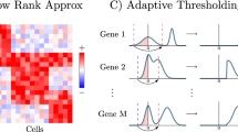 Imputation (Fig. 1 steps 4–6): The values in the gene expression matrix are systematically imputed based on a sliding window. A rectangular ROI is defined with a width and height smaller than the width and height of the expression matrix. The ROI serves as a window into the matrix—only the values within the window are manipulated in a single instance. The sliding parameters, including the ROI and step sizes, are then defined to determine the distance that the window shifts for each iteration. For each window position, a histogram of the values in the window is computed. This histogram is equalized to the histogram of the denoised expression values found in the previous step. The new window values found through histogram equalization substitute for the original values. The window continues sliding until the entire matrix is imputed.