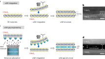 Since the early years of STM measurements28,29,30, a whole field emerged from the investigation of self-organizing molecular monolayers on graphite. This broad literature31,32,33 aids us in identifying the few possible molecules and ruling out a large variety of functional groups. We were able to achieve atomic resolution in low-temperature (9 K) STM images (Figs. 1c and 3a) on the contaminant molecular layer enabling us to resolve the inner structure of the stripes: the arrangement of the molecules, their precise length, and lattice periodicity. The individual linear molecules lie side-by-side forming the stripes observed by AFM in the direction almost perpendicular to the molecular axis (light blue arrows in Fig. 1). The molecules in adjacent stripes tend to be shifted by a half-molecule width, perpendicular to the molecule axis. The crystal structure of the contaminant layer varies between centered rectangular (cell angle: 90°) and centered oblique (cell angle: 80–85°) regions (see Supplementary Fig. 12). We measured 3.27 ± 0.15 nm for the width of the stripes, which corresponds to an all-trans length of alkyl chains, having 24–25 carbon atoms34. This width is in excellent agreement with the stripe width measured by AFM at room temperature (Fig. 1a), where we found 3.4 ± 0.3 nm on graphite and 3.7 ± 1 nm on hBN substrates.