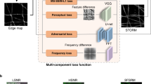 Figure 6 also shows the result of post-processing of the STED image with sf-MSSR1 (Fig. 6g). We note an increase in contrast and resolution from confocal to STED and then to STED + sf-MSSR1 (compare panels e–g in Fig. 6). To assess the resolution change provided by either STED or STED + sf-MSSR1 we used the image decorrelation approach34. The bottom panels of Fig. 6e–g, show the resolution computed at a confocal image (315–330 nm), STED (80–100 nm) and STED + sf-MSSR1 (19–22 nm). Based on these results, it is concluded that sf-MSSR1 processing succesfully increases the spatial resolution of STED images.
