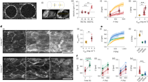 Having developed a model to describe how RhoA-driven contractility and Rac1-mediated actin polymerization interact to govern endothelial junction strength and recovery, we investigate how junctional remodeling depends on crosstalk between these processes. Initially considering a bicellular border, our model predicts that dynamic behavior emerges in cycles of cell protrusion, adhesion formation, junction strengthening, and rupture (Fig. 3b; Supplementary Movie 8). Polymerization-induced protrusive stresses reduce cell-cell gap width over time (Fig. 3c), ultimately facilitating intercellular contact, which enables spontaneous cadherin bond formation (Fig. 3e). This behavior can be directly observed in Supplementary Movies 1-2. As the density of bonds \({c}_{b}\) increases, the adhesion-dependent signaling feedback strength also increases (via Eq. 3), promoting an increase in cell contractility \(\rho\) through myosin phosphorylation and crossbridge cycling (Fig. 3f). Within a cadherin bond catch regime, higher contractility reduces bond dissociation which overall promotes a higher computed bond density. To test these model predictions, we carried out time-series imaging of GFP-VE-cadherin and mScarlet-Myl9 (myosin light chain) at cell-cell interfaces, which revealed a concurrent increase in localized cadherin and myosin concentrations (Figure S6a-c; Supplementary Movie 12). In conjunction with increased cadherin density and contractility, our model suggests that polymerization-induced stress \({\sigma }_{{{{{{{{\rm{P}}}}}}}}}\) reduces, via RhoA-associated Rac1 suppression (Fig. 3g). Supporting our model predictions and observations, using high-speed imaging Yamada and Nelson (2007) observed that Arp2/3-induced lamellipodia rapidly give way to stress-activated RhoA recruitment following intercellular contact, driving a strengthening of nascent cell contacts54. Development of higher contractility in our model over time then pushes the adhesion into a slip-regime, driving rapid bond dissociation which in turn increases the force acting on individual bonds (Fig. 3d). Rupture ensues when this force exceeds the threshold value, causing cell-cell separation. Time-series analysis of remodeling at cell-cell junctions indeed revealed that further increases in myosin intensity was followed by a loss of local cadherin and subsequent junction failure (Figure S6a-c; Supplementary Movie 12). Kugelmann et al (2018) also demonstrated that increased RhoA-associated contractility following thrombin or histamine treatment causes a breakdown in adherens junctions27. In our model, a loss of adhesion-mediated signaling then lowers contractility (Fig. 3e-f), in turn facilitating a restoration of the polymerization-induced stress to reconnect cells (Fig. 3c,g). This process is predicted to cycle repeatedly, closely resembling the ‘stick-slip’ cycle often reported in mesenchymal-type migration55,56. We directly compared predicted junctional remodeling with our observations of gap formation and recovery at HUVEC boundaries (Fig. 3h–j) over normalized timescales, with the model showing excellent agreement with experimental observations. Gap formation corresponds with a reduction in cadherin density (Fig. 3h). In response to a gap forming, protrusions emerge from the cell edge (Fig. 3j) to re-establish cell adhesion. This is followed by an increase in cadherin density and cell contractility, with an associated decay in protrusion.