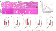a Representative images showing mCherry fluorescence and anti-mCherry staining in heart sections from young (3 months, for IF and IHC) and old (23 months, for IF; 16 months, for IHC) Glb1+/m mice. Scale bar, 50 µm. b Comparison of thickness of systole/diastolic left ventricle anterior wall (LVAWs/d) and systole/diastolic LV posterior wall (LVPWs/d) between Glb1+/m mice with high (H, n = 5) and low (L, n = 15) GAC signal and between middle-aged (MA, n = 20) and late-aged (LA, n = 20) Glb1+/m mice, as determined by echocardiography. Representative echocardiographic images of H (top) and L (middle) group mice are shown on the far right. c Left ventricle end diastolic volume and end systolic volume in Glb1+/m mice grouped by GAC signal (H, n = 5, and L, n = 15) or chronological age (MA, n = 20, and LA, n = 20). d Left ventricle ejection fraction and fractional shortening in Glb1+/m mice grouped by GAC signal (H, n = 5, and L, n = 14) and chronological age (MA, n = 19, and LA, n = 19). “n” represents number of biological replicates. Data represent the means ± s.e.m. p value was calculated by Student’s t test (two-sided).