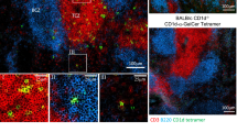 Antibodies were conjugated with the MaxPar conjugation kit according to the manufacturer’s instructions with the exception of cisplatin-labeled antibodies. Metal isotopes were obtained from Standard BioTools with the exception of Indium 113 and 115 (Trace Sciences). Conjugated antibodies were stored in PBS‐based Ab stabilizer (Candor Biosciences) and all antibodies were titrated for optimal staining concentrations with control mouse tissues. Full details of the staining panel are provided in Supplementary Table 1. For staining, 1 × 106 cells per sample were initially barcoded with metal-conjugated CD45 antibodies in the presence of Fc blocker for 30 min at RT and then washed twice in CyFACS buffer (PBS with 0.1% BSA and 2 mM EDTA) and then barcoded cells were pooled. Pooled cells were stained with a metal-conjugated surface stain antibody cocktail for 45 min at RT. Cells were then washed twice in CyFACS buffer, stained for viability with the cisplatin analogue dichloro-(ethylenediamine) palladium (II) in PBS for 5 min at RT and then fixed and permeabilized using the Foxp3 Transcription Factor Staining Buffer Set according to the manufacturer’s protocol (Thermo Fisher Scientific). Cells were subsequently stained with an intracellular antibody cocktail for 45 min at 4 °C. Cells were then washed twice in CyFACS buffer and once in PBS. Cells were then fixed overnight in 2% formaldehyde solution containing DNA Cell-ID Intercalator-103Rh (Standard BioTools). Prior to acquisition, cells were washed once in CyFACS buffer and twice in H2O. Cells were then diluted to 1 × 106 cells/ml in H2O containing 15% EQ Four Element Calibration Beads (Standard BioTools) and filtered. Cells were acquired at a rate of 200–300 cells/s using a Helios mass cytometer (Standard BioTools). Flow Cytometry Standard files were normalized to EQ bead signal. Initial gating and debarcoding was performed in CytoBank software. Clustering was then performed after gating on B cells (B220+CD3–) or CD4 T cells (CD4+CD3+TCRβ+B220–) by FlowSOM within the CATALYST Bioconductor package referring to CyTOF workflow (version 3)56. Differential abundance analysis of clusters was performed with edgeR, calculating adjusted p-values.