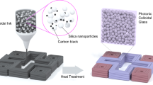 The assembly of colloidal particles is characterized using scanning electron microscope (SEM, S-4800, Hitachi, Japan) at an accelerating voltage of 5.0 kV. Micro-computed tomography (Micro-CT) images are shot and reconstructed by using Micro-CT equipment (Skyscan 1272, Bruker, Germany). Freeze-drying is conducted using the lyophilizer (FD-1A-50, Boyikang, China) to obtain the hydrosoluble photoinitiator TPO-H and the lyophilized samples for SEM characterization. Optical images of the structure and real-time monitoring of the printing process are obtained by the digital camera (CU-VF100AC, JVC, Japan). Fourier transform infrared (FTIR) spectrum is measured by FTIR spectrometer (TENSOR-27, BRUKER, Germany). Reflectance spectra are measured by fiber optic spectrometer (NoVA-EX, IdeaOptics, China) through an optical microscope (BX53, OLYMPUS, Japan). The values of pH are measured using a laboratory pH meter (FE20, METTLER TOLEDO, China). Zeta potentials of PS latex particles in the pure aqueous solution and the aqueous mixture are measured by Zetasizer Nano (Nano ZS ZEN3600, Malvern Instrument, UK). Each reported zeta potential is an average of at least three independent measurements. Mechanical properties of the just printed 3D PCs structure and pure acrylamide hydrogel structure are measured by tensile testing at a drawing rate of 20 mm/min−1 using universal testing machine (Instron5567, USA).