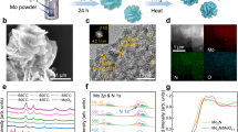 Electrochemical measurements were conducted on a typical three-electrode system (CH Instruments 760E). All potentials were referenced to a reversible hydrogen electrode (RHE) and without iR compensation. The binder solution was prepared by mixing of 5 wt% Nafion solution (40 μL) with 1 mL of 4:1 v/v deionized water/ethanol. The catalyst ink was then prepared by dispersion of 2 mg Mo2C hybrids (H-Mo2C/NG, Mo2C/NG, and control samples) into binder solution followed by ultrasonication for 2 h. In Mo2C hybrids, molybdenum atoms are the active species, and molybdenum loading (~ 8 wt%, Supplementary Table 5) is basically the same. To maintain the same metal load, 8 mg Pt/C catalyst (20 wt% Pt on graphitized carbon, Johnson Matthey) ink was prepared in the same way. The ink (10 μL) was then dripped onto a carbon fiber paper (CFP, 5 mm × 5 mm) as the working electrode. The electrode was allowed to dry at room temperature for at least 24 h before measurement. After drying, a catalyst (Mo2C hybrids and Pt/C) mass loading of 0.038 mg cm–2 was obtained. A graphite rod as the counter electrode and saturated calomel electrode (SCE) as the reference electrode. All potentials were referenced to RHE: ERHE = ESCE + (0.242 + 0.059 pH) V. In 0.5 M H2SO4 and 1.0 M KOH solutions, the polarization curves were obtained at the electrode potential of 0 to 0.45 V using a scan rate of 50 mV s−1. The electrochemical EIS was performed from 10–2 to 106 Hz with an AC voltage of –5 mV. Galvanostatic charge discharge curves of H-Mo2C/NG were recorded at j = –100, –200, and –300 mA cm–2. Prior to all measurements, the electrochemical system was purged with H2 bubbles for 30 min, and then conducted all electrochemical measurements at room temperature (25 °C) under ambient atmosphere.