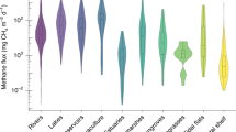 Methane concentrations decreased progressively from the estuary and coastal sites to the offshore waters. The concentrations were generally higher than 20 nM at the estuarine sites (maximum of 79 nM), but lower than 8 nM in waters deeper than 50 m (Fig. 1c). Methane was supersaturated with respect to atmospheric equilibrium in the surface waters at all study sites, and the saturation state ranged from 145 to 3229% (Fig. 1e). Sea-to-air fluxes varied between 2.7 and 99.6 µmol m–2 d–1 (average: 20.6 ± 22.3 µmol m–2 d–2) (Fig. 1f). Although the ECS represents only 0.23% of the global ocean (~7.7 × 105 km2)16, the annual release of methane from the ECS (~0.09 Tg CH4 yr−1) could account for 1.4–4.1% of the global diffusive ocean-to-atmosphere methane flux (2.2–6.3 Tg yr−1)3, underscoring the disproportionate contribution of near-shore and shelf areas to global ocean methane emissions.