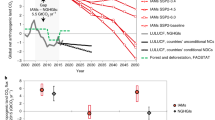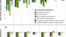 Annual net CO2 emissions from land-use change and management are calculated based on changes in carbon stocks of vegetation, and therefore may vary substantially between time steps (stock-flow problem). To avoid our results being biased by the values of single years, we calculate in a post-processing step an average value by applying a low-pass filter that distributes annual net CO2 emissions over time, while making sure that the time integral over the modeled period remains the same. Carbon stock changes in vegetation are subject to land-use change dynamics such as the conversion of forest into agricultural land41. In case of re/afforestation or when agricultural land is taken out of production, regrowth of natural vegetation removes CO2 from the atmosphere. N2O emissions from agricultural soils (fertilizer application) and animal waste management are estimated based on nitrogen budgets for croplands, pastures, and the livestock sector42,43. CH4 emissions from agriculture include emissions from enteric fermentation, animal waste management, and rice cultivation, which are estimated based on feed demand, manure, and rice cultivation area, respectively42,44. CO2, CH4, and N2O emissions from managed peatlands (drained and rewetted) are calculated based on IPCC wetland GHG emission factors45. The calculation of CO2 emissions from wood harvest, carbon storage in wood products, and carbon uptake in timber plantations follows the methodology described in Mishra et al.40. In mitigation scenarios, AFOLU GHG emissions are subject to pricing. CO2 emissions are reduced endogenously through reduced conversion of forests, other natural lands, and intact peatlands, while CH4 and N2O emissions are reduced based on marginal abatement cost curves44,45,46. In addition, the CO2 price serves as an incentive for re/afforestation and peatland restoration (rewetting of degraded peatlands)45,47. Validation of main land types and GHG emissions is available in the SI (Figs. S7, S8).
