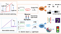 The integrate-and-fire function with features of all-or-nothing, strength-modulated frequency response and threshold-driven spiking were simulated by applying consecutive electrical pulses to the artificial neuron (pulse width of 1 ms, amplitudes of 0.5, 1, and 1.5 V), where the firing threshold was set as 1 pA, as shown in Fig. 3d–f, Supplementary Fig. 18. Conductive atomic force microscopy was employed to analyze the current mapping image and working mechanism of the memristive neuron (Fig. 3g, Supplementary Fig. 19). Current value and area in the film of MoS2/HfAlOx gradually increased when the voltage applied on the top electrode of Ag fiber, indicating that the conductive filaments gradually grew and dispersed into multiple channels. Besides, the electrical threshold-switching curve under positive voltage was fitted using models of Ohm’s law, trap and trap-filled limited space charge limited current. The fitting results were shown in Supplementary Fig. 20. The mechanism of reconfigurable characteristics in device could be attributed to the modulation of Ag conductive filaments in functional layer, where weak and strong conductive filaments were formed in volatile and nonvolatile switching states of device, respectively (Supplementary Figs. 21, 22). Moreover, such results further support the mechanism diagrams shown in Fig. 3h.