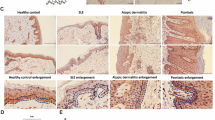 T cells, B cells and NK cells were separately stained for CD3 (MAB-0740, MXB Biotech), CD19 (1:1000, ab134114, Abcam) and CD56 (1:400, ab75813, Abcam) expression. CCL20+ keratinocytes were stained with CCL20 (1:50, ab224188, Abcam) and KRT10 (1:500, ab76318, Abcam). CXCL1+ fibroblasts and HLA+ Fib1 were identified by staining CXCL1 (1:100, ab89318, Abcam) and HLA-DRB1 (1:1000, ab133578, Abcam) with Vimentin (1:20000, ab92547, Abcam). ELANE (1:2000, ELA-2, ab131260, Abcam) was used to stain neutrophils. CCL19 (1:500, 13397-1-AP, ProteinTech) staining was performed in fibroblasts, and CCR7 (1:500, 25898-1-AP, ProteinTech) staining was performed in macrophages (CD68, 1:400, ab955, Abcam). The second antibodies used in this study came from Abcam (Donkey Anti-Rabbit IgG, 1:1000, ab205722, Abcam). All immunofluorescence experiments were conducted as follows70. Briefly, skin biopsy samples were embedded in paraffin and sectioned into 4 µm thick sections. After the paraffin tissue sections were baked, dewaxed, and rehydrated, they were used for antigen retrieval under acidic conditions in a pressure cooker. After peroxidase enzymes were removed, the cutaneous lesions were sealed with 5% serum (Well-Biology, CN). Then, the samples were incubated with primary antibodies at room temperature for 1 h or at 4 °C overnight. After incubation with secondary antibodies and staining with reagents from an Opal 7-color IHC detection kit (NEL811001KT, PerkinElmer, Hopkinton, MA), histologic sections were observed with an LSM 510 confocal microscopy system (Leica) or PerkinElmer Vectra (Hopkinton, MA). All images were analyzed using inForm software compatible with the PerkinElmer Vectra.