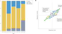 Values for sex bias represent the number of traits that showed greater parameter value when male and female mice differed significantly. That is, we counted which sex displayed the greater intercept, slope and higher magnitude of variance. Sex bias in the slope and intercept values, in addition to the magnitude of variance (residual SD), showed considerable variability across functional groups, suggesting trait-specific patterning of sex differences. For scenario A, representing traits with significant differences in slope, most traits showed greater slope magnitudes for males (n = 10 traits), rather than for females (n = 7 traits) (Fig. 2a). For scenario B, females showed greater intercept magnitudes for heart, morphology, immunology, and eye functional groups (n = 91 traits), whereas males showed greater intercepts for traits in physiology, metabolism, haematology, behaviour and hearing functional groups (n = 63 traits) (Fig. 2b). Overall sex bias (63 male traits: 91 female traits, Fig. 2b) was slightly greater for intercept differences, compared to slope differences (10 male traits: 6 female traits, Fig. 2a). Scenario C, which represents significant slope and intercept parameter differences between the sexes, was predominated by mixed bias across three out of nine functional groups (n = 26 traits), indicating that traits most frequently showed a mixture of directional differences in bias, comprising a combination of male bias in one parameter (slope or intercept) and female bias in the other parameter (slope or intercept) (Fig. 2c). Immunology and hearing-related traits represent an exception under scenario C, whereby traits with significant differences between the sexes did not show a mixed bias for slope and intercept values, consistent with few sex differences among traits. Across functional groups, male bias is slightly more common (5 groups) than female bias (4 groups) for statistically significant sex difference in residual SD, indicating that where traits show differences between the sexes, it is more common for males to be more variable than females, than vice versa (Fig. 2d) (152 male traits: 97 female traits).