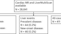 We observed a consistent pattern of association between the liver and heart across all imaging metrics considered. The most convincing associations were observed between liver fat and the heart, with higher PDFF strongly linked to reduced LV stroke volume and more concentric LV remodelling, a pattern which has been connected to poorer mortality and clinical outcomes36. Although previous work has linked clinically diagnosed fatty liver disease to poorer heart health, and LV hypertrophy in particular37, our study validates this relationship at the organ tissue level, in a large population-based sample mostly free from clinical disease. Greater liver fibro-inflammation (cT1) and higher liver iron were also linked to adverse cardiac features, but these were less dominant than the liver fat associations. In this context, it is worth considering that, in many individuals, elevated liver fat precedes liver fibrosis, and it is possible that the stronger association of measures of cardiac health with liver fat rather than fibro-inflammation is simply due to the fact that in the UK Biobank population, changes in fat are of a greater magnitude than changes in fibro-inflammation. Hence, it is possible that associations of heart health with liver fibro-inflammation may become more dominant in a population with more advanced liver disease.