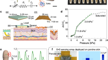 Figure 4a illustrates a schematic structure describing the piezocapacitive pressure-sensing mechanism (termed mechanosensitive piezo-ionic dynamics) of CLiPS-based e-skin devices (1 cm × 1 cm, the thickness of 260 µm) sandwiched between two deformable self-healing electrodes (1.5 cm × 1.5 cm), creating electrical double layer (EDL) at the interface. At pre-stimulus conditions, the majority of the [EMIM]+[TFSI]– ion pairs are trapped to the Cl groups within the PU matrix. We note that Cl groups are partially negatively charged species that attract positively charged [EMIM]+ cations (bounded to [TFSI]– anions through Coulomb attractive forces4) via ion–dipole interactions. Nevertheless, some ions can exist independently across the polymer matrix, primarily through intercalation between the PU hard segments3 as depicted in Supplementary Fig. 5 (see Supplementary Note 1 for details). Under external pressure (Fig. 4b), the CLiPS-based e-skin underwent gradual deformation, thereby decreasing the distance between the top and bottom electrodes, which created a strong electric field. Notably, the deformation caused by the applied pressure initiates an ion-pumping phenomenon, releasing more free ions, which induces the formation of EDL at the electrode/electrolyte interface. The mechanosensitive piezo-ionic dynamics arise from the pressure-mediated breaking of the ion–dipole interactions, which causes the detachment of the ion pairs from the Cl groups to form the EDL. The established trap and release phenomenon of the ions ensures a low initial capacitance value, and alternatively, generates a high final capacitance value under pressure owing to the effective pumping of ions. This provides an improved control of piezo-ionic dynamics, in addition to providing high sensitivity, and high signal-to-noise level in the CLiPS-based e-skin devices.
