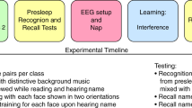 Sleep was recorded using a portable amplifier (SOMNOscreen EEG 10–20, DOMINO Steuerung 2.5., Somnomedics, Randersacker, Germany). EEG recordings were obtained with electrodes attached at F3, FZ, F4, C3, C4, P3, PZ, and P4 as well as left and right mastoids, referenced to CZ filtered between 0.03 and 35 Hz, and sampled at 256 Hz. The electrooculogram and the electromyogram were recorded bipolarly from electrodes close to the eyes and under the chin, respectively. Offline, EEG signals were re-referenced to the average potential at the left and right mastoid electrodes. Sleep recordings were visually scored according to standard criteria53. For each nap, total sleep time and the time spent in the different sleep stages (1, 2, slow wave sleep, and REM sleep) were determined. Sleep scoring was performed using REMBRANDT 9 Diagnostic software (Natus Medical, Pleasanton, USA).
