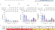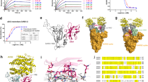 Pseudoviruses carrying the full-length spike envelope of prototype SARS-CoV-2 and VOCs, and sarbecoviruses were generated as previously reported10. Specifically, human immunodeficiency virus backbones expressing firefly luciferase (pNL4-3-R-E-luciferase) and pcDNA3.1 vector encoding either SARS-CoV-2 or sarbecovirus spike proteins were co-transfected into the HEK293T cells (ATCC). Forty-eight hours later, pseudoviruses in the viral supernatant were collected, centrifuged to remove cell lysis, and stored at -80 °C until use. The wildtype pseudovirus used throughout the analysis was the prototype strain (GenBank: MN908947.3) with a D614G mutation (WT D614G). The Alpha variant (Pango lineage B.1.1.7, GISAID: EPI_ISL_601443) included a total of 9 reported mutations in the spike protein (69-70del, 144del, N501Y, A570D, D614G, P681H, T716I, S982A and D1118H). The Beta variant (Pango lineage B.1.351, GISAID: EPI_ISL_700450) included 10 identified mutations in the spike such as L18F, D80A, D215G, 242-244del, S305T, K417N, E484K, N501Y, D614G and A701V. The Gamma variant (Pango lineage P.1, GISAID: EPI_ISL_792681) had 12 reported mutations in the spike including L18F, T20N, P26S, D138Y, R190S, K417T, E484K, N501Y, D614G, H655Y, T1027I and V1176F. The Delta variant (Pango lineage B.1.617.2, GISAID: EPI_ISL_1534938) included 10 reported mutations in the spike such as T19R, G142D, 156-157del, R158G, A222V, L452R, T478K, D614G, P681R, D950N. The Omicron BA.1 variant (Pango lineage BA.1, GISAID: EPI_ISL_6752027) was constructed with 34 mutations in the spike such as A67V, 69-70del, T95I, G142D, 143-145del, 211del, L212I, ins214EPE, G339D, S371L, S373P, S375F, K417N, N440K, G446S, S477N, T478K, E484A, Q493R, G496S, Q498R, N501Y, Y505H, T547K, D614G, H655Y, N679K, P681H, N764K, D796Y, N856K, Q954H, N969K, and L981F. The Omicron BA.2 variant (Pango lineage BA.2, GISAID: EPI_ISL_8515362) was constructed with 29 mutations in the spike such as T19I, 24-26del, A27S, G142D, V213G, G339D, S371F, S373P, S375F, T376A, D405N, R408S, K417N, N440K, S477N, T478K, E484A, Q493R, Q498R, N501Y, Y505H, D614G, H655Y, N679K, P681H, N764K, D796Y, N969K and Q954H. The Omicron BA.2.12.1 variant (Pango lineage BA.2.12.1, GISAID: EPI_ISL_12560123) was constructed with 30 mutations in the spike such as T19I, 24-26del, A27S, G142D, V213G, G339D, S371F, S373P, S375F, T376A, D405N, R408S, K417N, N440K, L452Q, S477N, T478K, E484A, Q493R, Q498R, N501Y, Y505H, D614G, H655Y, N679K, P681H, N764K, D796Y, N969K and Q954H. The Omicron BA.4/5 variant (Pango lineage BA.4/5, GISAID: EPI_ISL_12559461) was constructed with 30 mutations in the spike such as T19I, 24-26del, A27S, G142D, V213G, G339D, S371F, S373P, S375F, T376A, D405N, R408S, K417N, N440K, L452Q, S477N, T478K, E484A, F486V, Q498R, N501Y, Y505H, D614G, H655Y, N679K, P681H, N764K, D796Y, N969K and Q954H. The Kappa variant (Pango lineage B.1.617.1, GISAID: EPI_ISL_1384866) was constructed with 8 mutations in the spike such as T95I, G142D, E154L, L452R, E484Q, D614G, P681R and N1071H. The Eta variant (Pango lineage B.1.525, GISAID: EPI_ISL_ 2885901) included 8 mutations in the spike such as Q52R, A67V, 69-70del, Y144del, E484K, D614G, Q677H and F888L. The Iota variant (Pango lineage B.1.526, GISAID: EPI_ISL_ 2922249) was constructed with 6 mutations in the spike such as L5F, T95I, D253G, E484K, D614G and A701V. The Lambda variant (Pango lineage C.37, GISAID: EPI_ISL_ 2930541) was constructed with 8 mutations in the spike such as G75V, T76I, R246N, 247-253del, L452Q, F490S, D614G and T859N. The Epsilon variant (Pango lineage B.1.429, GISAID: EPI_ISL_ 2922315) was constructed with 4 mutations in the spike such as S13I, W152C, L452R and D614G. The variant with Pango lineage A23.1, GISAID: EPI_ISL_ 2690464) was constructed with 4 mutations in the spike such as F157L, V367F, Q613H and P681R. The G339D, S371L, S371F, S373P, T376A, R408S and S371L + D373P + S375F were constructed with a D614G mutation based on the WT strain. For sarbecoviruses, the cDNAs encoding the SARS-CoV-1 S glycoprotein (NCBI Accession NP_828851.1), Pangolin CoV GD spike (GenBank: QLR06867.1), Pangolin CoV GX spike (GenBank: QIA48614.1), Bat SARS-like coronavirus WIV16 (GenBank: ALK02457.1), Bat SARS-like RaTG13 spike (GenBank: QHR63300.2), Bat SARS-like ZC45 (GenBank: AVP78031.1), Bat SARS-like ZXC21 (GenBank: AVP78042.1) and Bat SARS-like coronavirus RsSHC014 (GenBank: AGZ48806.1) were synthesized with codons optimized for protein expression (Genwiz Inc., China) and verified by sequencing.