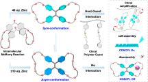 The three dimensional structures of biomolecules constructed by weak associating forces, such as hydrogen-bonds, cation-π, anion-π, and CH-π interactions, which are usually considerably weaker than metal–ligand coordination bonds, can often exhibit large structural changes promoted via guest recognition at their binding sites, called induced-fit and allosteric mechanisms23, 24. In many cases, rigid organic substrates will induce reorganization of the flexible binding pocket of an enzyme to increase guest affinity. In a similar way, the cooperative action of guest recognition and structural adaptivity within self-assembled 3D structures constructed by weak associating forces can endow a supramolecular system with additional complexity, providing a chance to afford an unusual low-symmetry structure as a thermodynamic product.