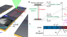 The four NV-center families are sensitive to microwave magnetic fields at their electron spin resonance (ESR) frequencies, which are determined by the magnetic bias field BNV via the NV spin Hamiltonian \(H=D{S}_{z}^{2}+\gamma {{{{{{\bf{B}}}}}}}_{{{\mbox{NV}}}}\cdot {{{{{\bf{S}}}}}}\), with D = 2.87 \({{\mbox{GHz}}}\) the zero-field splitting, γ = 28 \({{\mbox{GHz}}}/{{\mbox{T}}}\,\) the electron gyromagnetic ratio and \({S}_{i\in \{x,y,z\}}\) the ith spin-1 Pauli matrix. In this work, we align the field along one of the NV orientations, such that this “on-axis” family has \(|0\rangle \leftrightarrow|\pm 1\rangle\) ESR frequencies given by \(D\pm \gamma {B}_{{{\mbox{NV}}}}\) (with \({B}_{{{\mbox{NV}}}}=|{{{{{{\bf{B}}}}}}}_{{{\mbox{NV}}}}|\)). For the other three “off-axis” families, the bias field is equally misaligned by ~71° due to crystal symmetry, leading to the ESR frequency plotted in Fig. 4b (labeled “Off-axis”). The photoluminescence dips were recorded using continuous-wave microwaves and non-resonant optical excitation at 515 nm. For the Rabi oscillations, we first initialize the NV spin in the \(|0\rangle\)-state via a ~1-μs green laser pulse, then we drive the spin using an idler pulse and finally we read out the NV photons in the first 300–400 ns of a second laser pulse.
