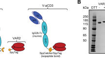 The codon-optimized VAR2CSA sequences of P. falciparum FCR3 and 3D7 (GenBank: ADG23053.1, AFN44727.1) were used to express seven rVAR2 with different CSA binding domains in this study. The rVAR2-1 and rVAR2-2, with hexahistidine tail, were expressed in Baculovirus-infected Sf9 cells (GenScript), as per the previous report66. Five other rVAR2 (rVAR2-3 to 7) were expressed in Shuffle T7 E. coli (EC2030S, WEIDI). Briefly, the codon-optimized target sequences were cloned into the pGEX-4T1 vector with a modified V5 tag and a 10 × His tag on the C terminus, allowing the expressed proteins to be detected by flow cytometry and immunofluorescence. Bacterial cultures harboring the plasmid were grown overnight and then inoculated into the fresh Terrific Broth (TB) medium. Freshly inoculated cultures were allowed to reach an optical density at 600 nm of 0.6. The cultures were subsequently induced with 0.1 mM isopropyl-β-d-thiogalactoside and grown overnight at 16 °C, followed by pelleting and lysing the cells via a cell disruptor (NJBIO) in lysis buffer (10 mM Na2HPO4, 1.8 mM KH2PO4, pH 7.1, 140 mM NaCl, 2.7 mM KCl, 5% Glycerol, 2 mM DTT, 1 μM DNase I, 1 mM phenylmethanesulfonylfluoride (PMSF), and protease inhibitor cocktail I, (C0001, TargetMol). The lysate was centrifugated at 40,000 × g for 1 h. The supernatant was filtered and incubated in Glutathione resins (GE Healthcare) for 1 h at 22 °C and then washed with wash buffer containing 10 mM Na2HPO4, 1.8 mM KH2PO4, pH 7.1, 140 mM NaCl, 2.7 mM KCl, 5% Glycerol, 2 mM DTT until the absorbance at 260 nm spectrophotometer reading reached a value of zero. The recombinant proteins were then digested with glutathione S-transferase (GST)-fused PSP overnight at 4 °C to remove the GST-tag and eluted with elution buffer 1(10 mM Na2HPO4, 1.8 mM KH2PO4, pH 7.1, 140 mM NaCl, 2.7 mM KCl, 5% Glycerol), and followed by adjusted the imidazole concentration of eluent to 15 mM and applied to the Ni-NTA column (GE Healthcare) equilibrated with binding buffer containing 20 mM sodium phosphate, pH 7.1, 150 mM NaCl, 15 mM imidazole, and 2 mM β-mercaptoethanol (β-ME). After washing with increasing concentrations of imidazole, up to 150 mM, the protein was finally eluted with 500 mM imidazole and desalted with desalt column (GE Healthcare).