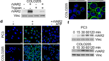 Cells were grown to 70–80% confluency. The attached tumor cells were treated with 4% paraformaldehyde and washed with PBS three times. The slides were blocked with 10% goat serum for 1 h at room temperature and incubated with rVAR2 in PBS containing 2% Bull Serum Albumin (BSA, MP) for 1 h at room temperature. Following staining with FITC conjugated anti-V5 antibody (1:500, R963-25, Thermo Fisher) and DAPI (G1012, Servicebio), images were taken by laser scanning confocal microscope (LSM 880, ZEISS).