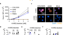 To evaluate the binding efficiency of all rVAR2 to cancer cells, we developed a flow cytometry assay relying on the interaction between V5-tagged rVAR2 and ofCS glycan expressed on cancer cells. Two blood samples from Leukemia patients and nine different cancer cell lines with variable origin, including lung adenocarcinoma cell line (A549), colorectal carcinoma cell lines (SW480, HCT116, LoVo, HT29, CaCo2, SW620), and esophageal cell carcinoma cell lines (KYSE180, KYSE30), were used to test the binding efficiency of all rVAR2. The successful bindings of rVAR2 to cancer cell lines were evidenced by significantly increased mean fluorescence intensity in a concentration-dependent manner (Fig. 1b). The binding efficacies of 7 rVAR2 to cancer cell lines are inconsistent with the above-mentioned CSA binding data (Supplementary Fig. 1d). Variable performances are found among different cell lines. rVAR2-1 and rVAR2-6, which contain two binding domains from FCR3 and 3D7, showed efficient binding in five cancer cell lines (SW480, HCT116, SW620, CaCo2, and HT29), and three cancer cell lines (LoVo, HCT116, and KYSE180), respectively, while the rVAR2-2 (one binding domain from FCR3) displayed overall poor performance than other rVAR2 (Fig. 1b), indicating the possible structural heterogenicity of ofCS glycan expressed on the cancer surface. Importantly, not only to cultured cancer cells, all rVAR2 were able to bind efficiently to blood cancer cells from Leukemia patients with no detectable binding to normal blood cells (Supplementary Fig. 1e).