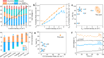 The electrochemical reduction of carbon dioxide to commodity chemicals and fuels has become a promising approach to mitigate CO2 emissions and store intermittent renewable energy1,2. To improve the efficiency of CO2 reduction reaction (CO2RR) to highly valuable multi-carbon products, substantial progress has been made in the development of gas-diffusion type flow cells (e.g., microfluidic reactors and membrane electrode assembly electrolyzers) to improve the mass transport of CO23,4,5,6,7,8. A reservoir of flowing highly alkaline electrolytes is typically used in these electrolyzers, with the purpose of increasing the full-cell energy efficiency by reducing the voltage required to drive the coupled anodic oxygen evolution reaction9. However, the use of highly alkaline electrolytes inevitably leads to electrolyte degradation and coking of the electrode due to the carbonate formation caused by the chemical reaction of CO2 and OH−, which poses great challenges to the improvement of carbon efficiency to support commercial applications10. In a few recent studies, the carbonate formation problem has been effectively reduced by conducting CO2 electrolysis in strong acid media or directly implementing carbonate to CO2RR products11,12,13. Despite the progress, the energy efficiency for the multi-carbon (C2+) products is below expectation due to their low total Faradaic efficiency (less than 50%) achieved at those conditions12,13. The use of CO instead of CO2 as the feedstock offers a means to address these challenges resulting from the undesired side reaction or low selectivity. In light of the comparatively mature electrochemical conversion of CO2 to CO in non-alkaline conditions (e.g., in strong acid media or using solid oxide electrochemical cell) with high efficiency11,14, the tandem strategy in which CO2 is first reduced to CO followed by further reducing CO to multi-carbon products shows significant promise15,16.