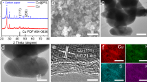 The powder X-ray diffraction patterns were recorded on an automated powder X-ray diffractometer (40 kV, 40 mA, Bruker, Model D8Advance) using a Cu Kα radiation source (l = 1.54178 Å). The field-emission scanning electron microscope images were recorded on a Merlin FESEM from Zeiss. SEM-EDS elemental maps were acquired with TESCAN VEGA3 SEM equipped with an Oxford Instruments x-act detector. X-ray photoelectron spectroscopy measurements were carried out using a PHI Quantera II. The resulting spectra were analyzed using the CasaXPS software package (Casa Software Ltd., U.K.). TEM sample was prepared using Ga+ focused ion on a ZEISS AURIGA® Field Emission-SEM implemented with CrossBeam® Workstations. TEM images and STEM-EDS elemental maps were acquired with a JEOL JEM-F200 TEM.