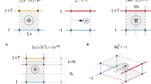 (iv) The fourth class (η invariants) is on relations between translations and reflections. For example, \(\eta={{\mathsf{M}}}_{x}{{\mathsf{L}}}_{y}{{\mathsf{M}}}_{x}^{-1}{{\mathsf{L}}}_{y}^{-1}\), and η = ± 1 corresponds to flux 0 or π through the plaquette in Fig. 1f that preserves Ly and Mx. Moreover, if \({{\mathsf{M}}}^{2}={{\mathsf{M}}}_{x}{{\mathsf{L}}}_{y}{{\mathsf{M}}}_{x}^{-1}{{\mathsf{L}}}_{y}^{-1}=-1\), we may design the flux pattern as in Fig. 1g.
