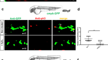 A zebrafish pdgfra-ΔPI3K was designed based precisely on a human dominant-negative pdgfra, with the substitutions Y706F (Y731F in humans) and Y717F (Y742F)29. Fragments containing amino acid substitutions were amplified by PCR using the clone containing full-length WT pdgfra (kindly provided by J. Eberhart, University of Texas at Austin) as a template. A 3 kb fragment covering the ORF was amplified in three fragments and the point mutations were introduced in the appropriate fragments using primers listed in Supplementary Table 4. A tandem HA-tag sequence was added in the frame at the C-terminus of pdgfra. Fragments encoding control or mutant pdgfra were cloned into hsp70 vector using Gibson assembly.