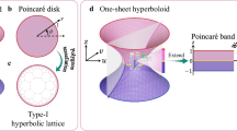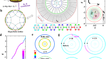 Figure 1c–e present the calculated hyperbolic energy bands at \({k}_{1}={k}_{4}=0\) with three different mass terms (m = 0, a = 0), (m = 0.7, a = 0.2) and (m = 0.7, a = 3.2), respectively. The value of \({t}_{j}\) and \({J}_{j}\) (j = 1, 2, 3, 4) always equal to 1. It can be seen that Dirac points appear at \(\varepsilon \) = 0 with the mass term being zero (m = 0, a = 0). Those Dirac points are protected by the existence of time-reversal symmetry and inversion symmetry. It is noted that the non-zero values of m and a can break the inversion and time-reversal symmetries, respectively. In this case, by introducing the non-zero mass term with (m = 0.7, a = 0.2), the Dirac points are gapped, as shown in Fig. 1d. We can define the second Chern number in the 4D momentum space (corresponding to four translation directions) of 2D hyperbolic model as \({C}_{2}=\frac{1}{8{\pi }^{2}}\int {d}^{4}{k\; tr}({\Omega }_{-}\wedge {\Omega }_{-})\), where the integral is taken over the 4D BZ of the {8,8} hyperbolic tiling and the trace runs over the wedge product of Berry curvature (\({\Omega }_{-}\)) for all energy bands lower than the Fermi energy. In this case, we find that the opened bandgap (the shaded region) possesses a non-trivial second Chern number with \({C}_{2}=3\) but a vanishing first Chern number. In addition, by further increasing the value of a (m = 0.7, a = 3.2), the topological bandgap around \(\varepsilon \)=0 is closed, and other two bandgaps around \(\varepsilon=\pm3.2\) appear, as shown in Fig. 1e. We also calculate the second Chern numbers of these two bandgaps, and find that they all equal to zero. While, the non-zero first Chern number defined in 2D BZ formed by the momentum pair \(({k}_{1},{k}_{4})\) equals to \({C}_{1}\left({k}_{1},{k}_{4}\right)=-1\) (\({C}_{1}\left({k}_{1},{k}_{4}\right)=1\)) for the energy gap around \(=-3.2\) \((\varepsilon=3.2)\). From above results, we can see that by suitably tuning mass terms, our proposed lattice model in the 2D hyperbolic space can exhibit topological physics with non-trivial second Chern numbers. In addition, we note that our proposed hyperbolic Bloch Hamiltonian with a = 0 has the same form with that of 4D quantum Hall model in Euclidean space42, indicating that exotic topological physics should also exist in the finite hyperbolic model.
