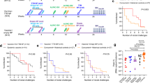 Examination of V1V2 specific responses showed that tonsil vaccination induced significant levels of SIVmac251WY30 and SIVmac239CS.23 gp70 VIV2 specific antibody responses prior to infection that were significantly boosted following infection (Fig. 4a, b). A similar response was observed against the heterologous SIVsmE660 isolate suggesting that tonsil vaccination induced high levels of non-nAb with potential activity against diverse isolates of SIV (Fig. 4c, d). Induction of V1V2 specific antibody responses was associated with significant levels of ADCC activity that negatively correlated with plasma viremia (Fig. 5a, e) suggesting a role for ADCC responses in control of acute viremia. This is in line with earlier studies and the R144 trial showing an inverse correlation between ADCC and HIV infection22,23,28,29,30,31,33,34. Other studies have reported induction of higher V2 specific responses in macaques that correlated with protection from acquisition25,26,27. Higher ADCC responses were associated with an increase in the absolute numbers of NK cells (Fig. 5b) that expressed significantly higher levels of perforin. These perforin+ NK cells were Ki-67− (Fig. 5d) and inversely correlated with plasma viremia (Fig. 5h) and positively correlated with ADCC titres (Fig. 5f) suggesting that non-proliferating NK cells significantly contributed to the control of acute viremia in vaccinated animals. Interestingly, Perforin+ NK cells that were Ki-67+ were found to positively correlate with plasma viremia (Fig. 5g), suggesting that these peripheral blood subsets were likely a marker of acute immune activation seen during SIV infection. Recent studies have shown that enhanced proliferation of follicular NK cells was associated with control of chronic SHIV infection63. Further studies are needed to clarify the role of proliferating peripheral NK subsets expressing high levels of perforin in SIV infection.