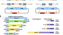 To gain further insight into the biology of morphogenetic haloarchaea (referring specifically to haloarchaea with hyphae differentiation and spore formation), the complete genomes of YIM 93972 and other five morphogenetic strains were sequenced. The genome of YIM 93972 is composed of a major chromosome (2,676,592 bp, 57.2% G + C content, 2803 predicted genes), a minor chromosome (844,905 bp, 54.7% G + C content, 722 predicted genes), and three plasmids (Supplementary Fig. 7; Supplementary Data 2a). Altogether, the genome of YIM 93972 encompassed 3744 predicted protein-coding genes, 47 tRNAs, and two rRNA operons (the two 16S rRNA genes shared 99.8% identity) located on the major and minor chromosomes. Although all six genomes of the morphogenetic haloarchaeal strains consisted of two chromosomes of different sizes, otherwise, we identified many distinct genomic features (Supplementary Data 2, Supplementary Data 2b–f). In particular, the genome sizes of YIM A00010 and YIM A00011 (5.97 Mb and 5.82 Mb, respectively) are substantially larger than those of the other four strains (3.23 Mb on average). Among the six strains, only YIM A00013 had two rRNA operons like YIM 93972, but the genome of the former carried fewer plasmids and encompassed fewer genes than the latter.