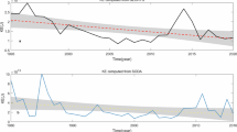 The linear trend was estimated by applying a one-dimensional linear regression model in the least-squares sense to explore the long-term variability of the LSDO. The F-statistic is used to test the significance of the regression model. Monte Carlo simulation with block bootstrapping66,67 is used to quantify the significance of the trends. Specifically, for a certain observed time series, we first (1) calculate the block length according to the effective decorrelation time τ67, and then (2) randomly resample with replacement blocks of length τ from the observed time series and concatenate them to create a time series with the same length of the observed one. Next (3), we conduct the regression of the series. After 1000 random simulations (B = 1000), sorting the fitted parameters (slope), the 95% (90%) confidence interval follows from the 25 and 975 (50 and 950) fitted values. This process is repeated 100 times (I = 100) to get average slopes. Meanwhile, effective degrees of freedom (DOF) could be verified using Neff = N/τ. By comparing the slope of each regression between the real (β) and randomized (βb,i, b = 1, 2,…, B; i = 1, 2, …, I) dependent variable, we obtain a frequency (i.e., the number of simulations have absolute values |βb,i | larger than |β | ) from each run, and then divide the count by 1000 to get the p-value (pi, i = 1, 2, …, I). After 100 iterations, we could obtain the averaged p-value. Most trends are statistically different from zero (p < 0.05), while the potential temperature trend at LT is not (p < 0.1). For time series (OBP and SLA) with low auto-correlation (smaller τ), we still use F-test statistics to obtain the p-value.