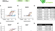 When E. coli cells are cultured aerobically in rich media such as the Luria-Bertani (LB) broth, the availability of nutrients supports rapid growth via glycolysis, the pentose phosphate pathway (PPP) and the tricarboxylic acid (TCA) cycle48. These pathways provide the bulk of NADPH (Supplementary Fig. 11), whose levels are reported to increase during the first hours of growth to progressively decline as cells enter the stationary phase48. Accordingly, a redox potential ENADP(H) of -308 mV was estimated with NERNST at the exponential phase (Fig. 2a, b). Oxidation of the NADP(H) pool became evident as bacteria entered the stationary phase (Fig. 2a), with ENADP(H) increasing to −286 mV (Fig. 2b).