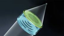 where Topt is the optimal thickness of the diffractive lens (Topt = 1.7 μm, which is close to the predicted value of \(\frac{{{{{{\rm{\lambda }}}}}}}{\Delta {{{{{\rm{n}}}}}}}=\frac{0.633{{{{{\rm{\mu }}}}}}{{{{{\rm{m}}}}}}}{0.38}=1.67{{{{{\rm{\mu }}}}}}{{{{{\rm{m}}}}}},\) SI Section 2 describes how Topt was experimentally determined), λ is the design wavelength, fdif(λ) is the target focal length of the diffractive lens, m is the zone number (m = 0, 1, 2, 3, etc.), and rm is the radius of the mth zone45. A second hybrid doublet was also designed by replacing the plano-convex refractive lens with a cylindrical GRIN lens (Fig. 1c). This GRIN element exhibits an aspheric refractive index profile, a center-to-edge index contrast of roughly 0.35 (see SI Section 3), and a thickness of 13 μm. The overall thickness of this hybrid lens was slightly higher than the 15 μm target, but a nearly equivalent Фhyb(λ) was maintained. The GRIN profile was produced by radially varying the local laser dosage during printing. See the Methods Section for a more detailed description of the fabrication parameters of each element.