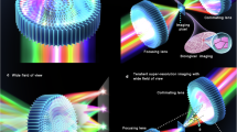The hybrid lens in Fig. 1b was designed to have a maximum thickness of 15 μm and a focal length error below 3%, allowing the hybrid doublet to assume a compact structure while forming high-quality images. The design goals were experimentally met through the integration of a diffractive component with Фdif(633 nm) = 0.0027 μm−1, which translated to an NA of 0.118 at 633 nm (Fig. 1d), and a plano-convex aspheric refractive component with 11 μm thickness. The diffractive lens was fabricated with a thickness of 1.7 μm and the gap between the two subcomponents was 2 μm, resulting in an overall thickness of 14.7 μm.