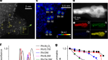 Aberration-corrected high-angle annular dark-field scanning transmission electron microscopy (ac-HAADF-STEM) image and energy-dispersive spectroscopy (EDS) measurements were carried out to explore the interfacial structure of xRhNi/TiO2 samples (Fig. 2 and Supplementary Figs. 18–23). For 0.3RhNi/TiO2 and 0.5RhNi/TiO2 catalysts, Rh tends to present an atomic-level dispersion on the surface of Ni particles to form RhNi bimetallic structure (Fig. 2f, g, and Supplementary Fig. 18), and a significant interface encapsulation of TiO2 on the surrounding of RhNi nanoparticle is observed after H2 activation (Fig. 2b1–b5, d, e, and Supplementary Fig. 20). However, visible TiO2-x overlayer recedes over RuNi bimetallic NPs when exposed to air oxidation conditions (Supplementary Fig. 21), which is consistent with the phenomenon from classical SMSI4,9,13,16,30,31,32. For 0.8RhNi/TiO2 and 1.0RhNi/TiO2 sample with a higher Rh content, Rh species shows an aggregation state on the surface of Ni particles (Supplementary Figs. 22 and 23). The results intuitively confirm the well-defined interface structure between RhNi bimetal and TiO2 support. In addition, Ni/TiO2 and Rh/TiO2 samples also show classic SMSI effect as demonstrated by STEM and elemental line scanning, in which the reversible overlayer of TiO2–x appears and disappears under the reduction and oxidation conditions, respectively (Supplementary Figs. 24–26).