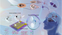 We employed a three-dimensional microscope to detect the height information of the multi-layered components (Fig. 1c). It is worth noting that the piezoelectric electret film had a porous sectional structure, and abundant air voids were distributed inside the polypropylene architecture, altering surface charge distribution during deformation37,38. The cross-sectional height profile was intercepted along a scanning line to quantify the multilayer geometry (Fig. 1d, Supplementary Fig. 2c and d). The thickness of the pHEMA, the PDMS, the PEG, and the ITO/PET layer were 48, 51, 84, and 23 μm, respectively. The hydrophobicity of the encapsulation layers composed of PDMS and pHEMA was shown in Fig. 1e. The contact angles of the PDMS and pHEMA films were 119.2° and 65.9°, confirming their hydrophobic and hydrophilic properties, respectively. Furthermore, the values of the oxygen permeability coefficient were 5.42 × 10−8 and 0.37 × 10−8 cm3•cm/cm2•s•cm•Hg for PDMS and pHEMA34,35, respectively (Fig. 1f and Supplementary Fig. 3). These water- and oxygen-permeable properties were necessary for long-term stable operation in a biological environment and avoided adverse effects on the eye microenvironment. The mechanical robustness of the flexible BPCL was verified through a pressing system using a spherical plastic ball with a diameter of 12 mm, where the dendrite number (Dn) of the star-polygon PEG was set as 12 (Fig. 1g). Finite element analysis (FEA) results of the BPCL under a series of pressing heights consistently indicated that the tensile strain was evenly distributed on the fractal structure and serpentine lines. Both FEA and experimental results displayed similar deformation behaviors. The strain (≤1.0%) sustained by the BPCL was consistently smaller than the failure strain (5%) even when the BPCL was pressed up to 10 mm, exhibiting its excellent stretchability (Supplementary Fig. 4). In addition, the BPCL was also repeatedly pressed from 0 to 10 mm without any structural damage, which further demonstrated the outstanding mechanical robustness of the BPCL. To ensure in vitro and in vivo biocompatibility of the encapsulated device, mouse fibroblast 3T3 cells were first cultured on the packaged BPCL surface and in a reference culture dish for three days to observe and compare the cell attachment, proliferation, and morphology. Cells in both media exhibited similar densities and equivalent morphologies. The fluorescent staining revealed that the cells in both groups could spread and form intact cytoarchitecture (Fig. 1h). The relative viability of cells on encapsulation material was exceeded 98% within three days, comparable to that of the cells cultured in the dish (Fig. 1i). In addition, during in vivo wearing process of rabbits for two weeks, the corneal optical images and the hematoxylin-eosin (H&E) staining result indicated that the BPCL was associated without corneal tissue injury or affecting regular daily activity (Supplementary Fig. 5 and Supplementary Movie 2). These results confirmed that the encapsulated BPCL is non-cytotoxic, biocompatible, and safe.