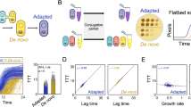 To test if this hypothesis was theoretically correct, we implemented a simple computer simulation of the LTEE (see Supplementary Note 1 for mathematical details). Just as in the LTEE, every 24 h, a 100-fold dilution in glucose medium was introduced in the simulation. In the simulation, the two strains grow at their respective growth rates (Fig. 1c) and consume glucose according to their respective biomass yield (Eq. S5), which is determined by their respective acetate excretion rates. Acetate accumulates in the medium as glucose is consumed (Fig. 1d). When glucose is depleted, cells undergo a lag phase without growth, whose duration is restricted by Eq. [2], before they resume growth on acetate (Fig. 1c).