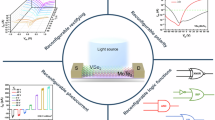 a, b Gate-dependent output curves of the device under illumination (635 nm). Dashed lines were measured in the dark. c Gate modulation of the responsivity (Rsc) at Vds = 0 V and open-circuit voltage Voc, respectively. d, e Output electrical powers at Vg > 0 and Vg < 0 as a function of drain-source voltage, respectively. Pin is the incident-light intensity. The dashed line indicates the increasing trend of Voc with Pin. f Output electrical power at Vg > 0 and Vg < 0 as a function of incident-light density. The inset shows Voc vs incident power density. the incident power density. ηPV is the power conversion efficiency. The standard deviations were used as error bars. g, h Fill factor (FF) at Vg > 0 and Vg < 0 as a function of the incident power density. The FF increased with the increasing amplitude of Vg. i Logic inverter based on the gate switchable photovoltaic performance. The white light power intensity was ranged from 0.1 mW/cm2 to 30 mW/cm2.