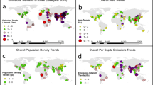 Other potential determinants of energy demand and emissions receive less attention than GDP, even though additional entry points to accelerate decarbonization are urgently required. Population density has been studied with varied outcomes. An econometric study of OECD countries 1980–2011 suggested an inverse relation between population density and CO2 emissions16; a regression analysis of materials used in >100 countries in 2000 found a similar effect17. A global regression analysis18 found no effect of population density on energy demand, whereas a panel analysis of 11 Asian countries from 1960–200419 to conditions that influence energy demand for heating or cooling of buildings20, fuel prices affecting demand for transport energy21, and the urbanization rate (urban population as percent of the total population). A suitable proxy for the climate dependency of heating energy demand are heating-degree days (abbreviated as HDD)20. The price of gasoline (abbreviated as PGAS) is an energy price indicator that is strongly related to settlement patterns21. Some studies used urban population as a percent of the total population (abbreviated as UPOP) as a development indicator22.
