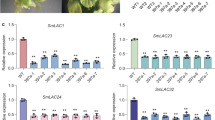To further address laccase function in cell wall lignification, we analyzed cross-sections of basal stems with phloroglucinol staining. Compared with the WT, lac25 lac32 showed lighter lignin staining, and loose cell arrangement with a degree of vessel collapse (Fig. 5c). The cell walls of lac19 lac25 lac32 showed more greatly decreased lignin staining, an even looser cell arrangement, and serious vessel collapse. The cell wall morphology of the single gene mutants of lac19 was not as obvious as that of the triple and double mutants (Fig. 5c). The cell morphology of the double and triple laccase mutants was similar to that of the miR408_OX poplars. In contrast, LAC19_OX, LAC25_OX and LAC32_OX exhibited neatly arranged xylem cells, with similar morphology to WT (Fig. 5d). Compared with the WT, the three LAC overexpression transgenic lines showed stronger staining (Fig. 5d). Klason analysis showed lignin content of the LAC19_OX, LAC25_OX and LAC32_OX plants were increased by 19.69%, 10.67% and 14.62% respectively (Supplementary Table 2).