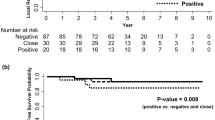 The 14 tumor-positive margins were detected in the surgical specimens of 13 patients with a sensitivity of 100% (95% CI 84.9–100%) on the patient level (for specificity, see below). In 10 of these 13 patients, margin status was the independent indication for adjuvant chemoradiotherapy, and in three cases, it was also indicated based on tumor characteristics or lymph node involvement. A total of 37 close margins were observed in 34 patients on final histopathology; 26 of these close margins in 23 patients were detected with FMI with a sensitivity of 67.4% (95% CI 64.2–71.1%) on the patient level. In the latter group, radiotherapy was indicated solely on margin status in 20 patients. Finally, 17 margins in 14 patients showed false-positive resulting in a specificity of 41.7% (95% CI 40.0–43.0%) on the patient level, meaning unnecessary adjuvant resections would have been advised in these cases.