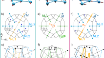 To view the band dispersion, we extracted the measured ARPES spectra along two high-symmetry paths, one along \({{\Sigma }}-{{\Gamma }}-{{\Sigma }}\left({{{{{{{\rm{S}}}}}}}}\right)-{{{{{{{\rm{Z}}}}}}}}\) (Fig. 2c), and the other along the diagonal Z − Y direction (Fig. 2e). For comparison, the DFT calculated band structure (lines) is overlaid on top, with red and orange indicating the NR1 and NR2 bands, respectively. Indeed, the nodes of the NR2 sit very close to EF, as is evident from the zoom-in band image and associated momentum distribution curves in Fig. 2d. Our data further show suppressed spectral weight near EF, suggesting the existence of a small gap. This is consistent with SOC induced gap (20 meV) at the crossing from DFT calculations. The ARPES spectra along the Z − Y path (Fig. 2e) also show clear linear-band crossings near EF, supporting the low dispersion feature along the ring for the NR2. As for the NR1, one branch of the bands appears to be clearer than the other (See the band dispersion along Γ − Σ in Supplementary Fig. 3b), possibly due to the matrix element effect.
