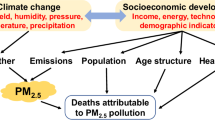 The number of DAPP is determined by four main factors: age structure, total population, PM2.5 concentration, and disease mortality14. Changes in these four factors are influenced by both climate change and socioeconomic change. For example, the changes in climate conditions such as temperature, humidity, and air pressure can directly affect the secondary transformation and diffusion of PM2.515,16, thereby changing the atmospheric concentration of PM2.5. Socio-economic development affects the emission of pollutants and PM2.5 concentration, as well as the demographic characteristics and the level of available healthcare, which affect the proportion of older adults in the population and the mortality rate of diseases17,18. Several studies have investigated the relationship between PM2.5 air pollution and the older adult population in China, mainly based on historical data to analyze the impact of population aging on a specific disease19,20,21 (e.g., respiratory disease or heart disease). For example, Chi et al. analyzed the impact of air pollution on older patients with chronic obstructive pulmonary disease and found that increased PM2.5 air pollution from heating during the winter months was associated with a reduction in forced expiratory volume21. Several studies have examined historical relationships between population aging and DAPP. For example, Liu et al. estimated the number of deaths caused by air pollution and concluded that population aging caused an additional 950,000 deaths from 2004 to 2017, delaying the reduction of the health burden of PM2.5 air pollution22. A few studies have estimated future changes of DAPP, with estimates based upon certain climatic or socioeconomic assumptions. For example, Yue et al. estimated China’s DAPP in 2030 under different PM2.5 concentration scenarios, but ignored changes in demographics and disease mortality7. Wang et al. estimated the health burden of DAPP in 2020 and 2030 based on air quality scenarios and population trends under the Shared Socioeconomic Pathways (SSPs)23. Although the study estimated the impact of population aging and other factors on DAPP in China based on future socioeconomic changes, it did not consider the changes in PM2.5 concentration in the context of climate change. Hence, there is an urgent need for a comprehensive and detailed quantification and projection of DAPP trends in China which ties these complex components together.