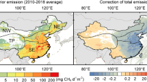 A first-order correction is carried out for biogenic CO2 fluxes to convert XCO2,xs to XCO2,ff by XCO2,ff = XCO2,xs—XCO2,bio, where XCO2,xs is the excess estimated from CLARS-FTS observations, and XCO2,ff and XCO2,bio are the contributions from fossil fuel and biogenic fluxes, respectively. We use the quantity XCO2,ff instead of XCO2,xs in the tracer-tracer inversion method to estimate CH4 emissions. The monthly ratios (CO2,ff/CO2,xs) estimated from two sets of isotope measurements by Newman et al.25 and Miller et al.26, respectively, are used in this study, for comparison of the annual patterns (Supplementary Fig. S7). Since there is no significant interannual trend in the biogenic fluxes in LA (see Supplementary Text 3), we apply the monthly averaged ratios derived from all available data in the extended Newman et al.25 data set (Supplementary Fig. S7). The time series of the excess ratio of XCH4,xs/XCO2,ff after correcting the biogenic fluxes is shown in Supplementary Fig. S8.