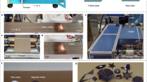 The JO-robot is constructed using polydimethylsiloxane (PDMS) doped with carbonyl iron particles, and it is fabricated by femtosecond laser writing and modification. With the advantage of efficient maskless processing, the cutting of JO-robot contour, the creation of creases and the surface modification of the top side can be achieved in one step by the femtosecond laser processing, which is difficult to achieve by other magnetic microrobots fabrication methods29,30,31,32 (Supplementary Fig. 5). The rectangular sheet-like soft structure has the advantages of simple design and various motion modes, and is widely used in the field of microrobots33,34. Here, the JO-robot is designed as a rectangle with two creases to achieve good magnetic response motion and multi-mode droplet manipulation (the size is 2 mm × 7 mm, the same hereinafter unless otherwise specified, detailed size is shown in Supplementary Fig. 6). During the curing process, the carbonyl iron particles doped in PDMS are arranged in chains to enhance the magnetic response. By controlling the laser cutting direction, the carbonyl iron particles chains are perpendicular to the long side of the JO-robot (Fig. 2a). The chains can be affected by the magnetic force and torque in the magnetic field, which drives the JO-robot to align with the direction of the magnetic field35,36,37. The magnetic force (F) and magnetic torque (T) excited by the periodic magnetic field can be given by (Supplementary Discussion 1):