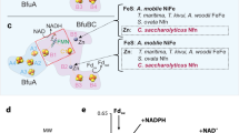 The protein concentration was determined according to Bradford43 using Bovine serum albumin (BSA) as a standard. Proteins were separated in 12% polyacrylamide gels according to Laemmli44 and stained with coomassie brilliant blue G250. The iron content was determined calorimetrically according to Fish45. The nature of the flavin was determined as previously described46. Size exclusion chromatography was performed12 and analysed using UNICORN 5.31 software.