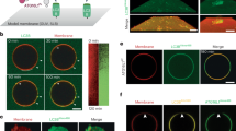 To characterize the dynamic features of hAtg3ΔN25, Δ90–190, we performed NMR hydrogen/deuterium (H/D) exchange experiments. Instead of quantitatively determining an exchange rate constant, for the purpose of this discussion, we classified the peaks observed in TROSY spectra into three groups according to their intensities in H/D exchange experiments. Group I amides include those that are in fast exchange (colored red in Fig. 1c) and have lost >67% of their peak intensities in the first 2D TROSY spectrum (data collection started ~21 min after the addition of a D2O buffer and took ~17 min to finish) relative to a reference spectrum collected in an H2O buffer. Group II amides exchanged slowly (colored cyan in Fig. 1c); more than 33% of their initial peak intensities remained in the last 2D TROSY spectrum taken after ~23 h of H/D exchange. Group III amides displayed intermediate H/D exchanges, slower than Group I and faster than Group II (colored orange in Fig. 1c). Most Group I amides are in unstructured loops, but surprisingly, the amides of residues in helix F also exhibit fast exchange, suggesting that this region is dynamic. Group II amides are generally located in β-sheets and helices B (residues 36–49) and G (residues 289–297). Group III amides are distributed throughout the structure. These results indicate that helix F is more flexible than the other two long helices, B and G. In addition, as we reported previously, the catalytic loop (residues 262–267) is likely involved in motions on the millisecond timescale since its NH peaks were not observed in the TROSY spectrum due to exchange broadening30. Taken together, our NMR results provide direct evidence that the catalytic loop and adjacent regions of hAtg3 are highly dynamic in aqueous solution. As we describe below, the structural changes in these regions are observed upon direct interaction with the membrane.