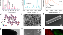 Transmission electron microscopy images were performed by Titan 80-300 ST, FEI. High-resolution scanning transmission electron microscopy images, selected area electron diffraction patterns, and energy dispersive X-ray spectroscopy mapping were performed by Titan Themis Z, FEI. Scanning electron microscopy images were conducted by Merlin, Zeiss, Germany. The lamella samples were prepared by Helios G4 UX dual beam system. The XRD patterns were recorded by a Bruker diffractometer (D8 Advance) with Cu Kα radiation, where the wavelength was 0.15406 nm. Operando XRD experiments were conducted by a Bruker D8 Advance Twin with Cu Kα radiation (λ = 0.15406 nm). Differential Scanning Calorimeter (DSC) measurements were performed from 20 °C to −80 °C and then back to 20 °C at 5 °C min−1 (DSC-TA Discovery 250) under a nitrogen atmosphere. Fourier transform infrared (FT-IR) spectra were recorded in the range of 700 to 4000 cm−1 by a Nicolet 6700 spectrometer. The current-sensitive atomic force microscopy (CS-AFM) analysis was performed in Tunneling Current AFM mode on the Dimension Icon Atomic Force Microscope system (Bruker, Santa Barbara, CA). Resistance measurements of MoO3 were carried out with a four-terminal configuration and low-temperature electrical measurements were performed in a Physical Property Measurement System (Quantum Design). X-ray photoelectron spectroscopy (XPS) analyses were conducted using a Kratos Axis Ultra DLD spectrometer outfitted with an Al Kα X-ray source (hν = 1486.6 eV) operating at 75 W. The system was equipped with a multichannel plate and delay line detector, and the experiments were conducted under a vacuum level of 1 ~ 10−9 mbar. High-resolution spectra were acquired with fixed analyzer pass energies of 20 eV. To prevent differential charging, the samples were positioned in the floating mode, and charge neutralization was applied to all samples as necessary. XANES spectra of HxMoO3 samples were collected using Si (311) crystal monochromators at the BL14W1 beamlines of the Shanghai Synchrotron Radiation Facility (SSRF) in Shanghai, China. Before the beamline analysis, the samples were compressed into thin sheets with a diameter of 1 cm and sealed using Kapton tape film. The X-ray Absorption Fine Structure (XAFS) spectra were acquired at room temperature utilizing a 4-channel Silicon Drift Detector (SDD), specifically the Bruker 5040 model. For Mo K-edge Extended X-ray Absorption Fine Structure (EXAFS) spectra, a transmission mode was employed. Minimal changes in line shape and peak position were observed in the Mo K-edge XANES spectra between successive scans conducted on a particular sample. Additionally, standard samples (Mo foil, MoO2) were also subjected to transmission mode recording for their XAFS spectra. The obtained spectra were subjected to processing and analysis using the software tools Athena and Artemis.
